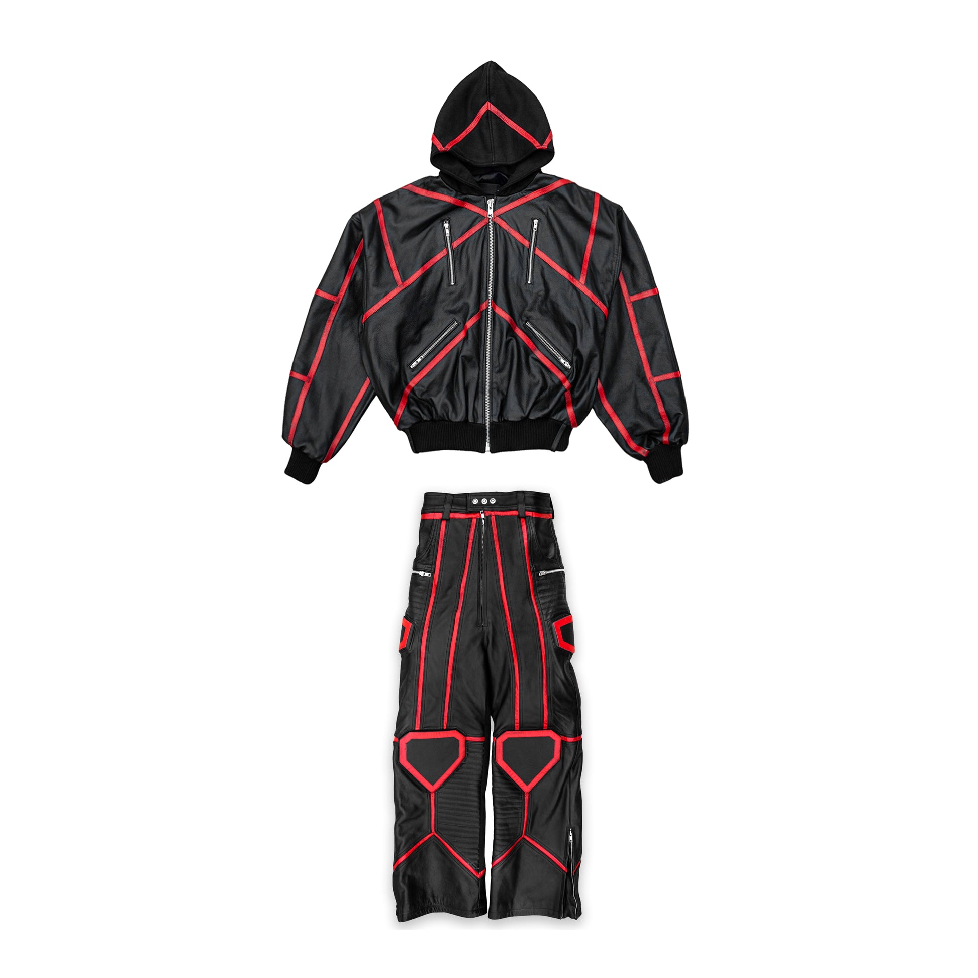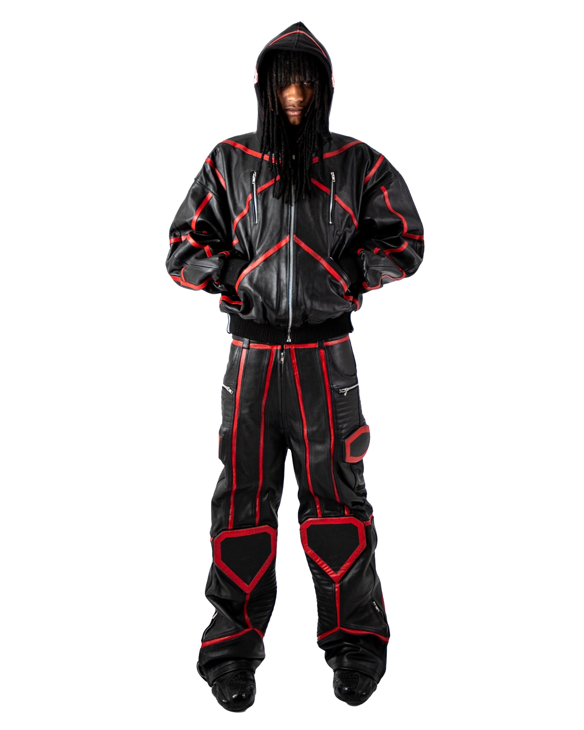 ovd x phtmne — collection 1. featuring the pryzm bomber jacket and moto pants set, engineered for motion and presence. crafted from genuine heavyweight cowhide leather with hand-sprayed white leather striping for bold contrast. the bomber jacket is structured with a french terry hood, elastic rib cuffs, and finished with heavy ykk hardware throughout.