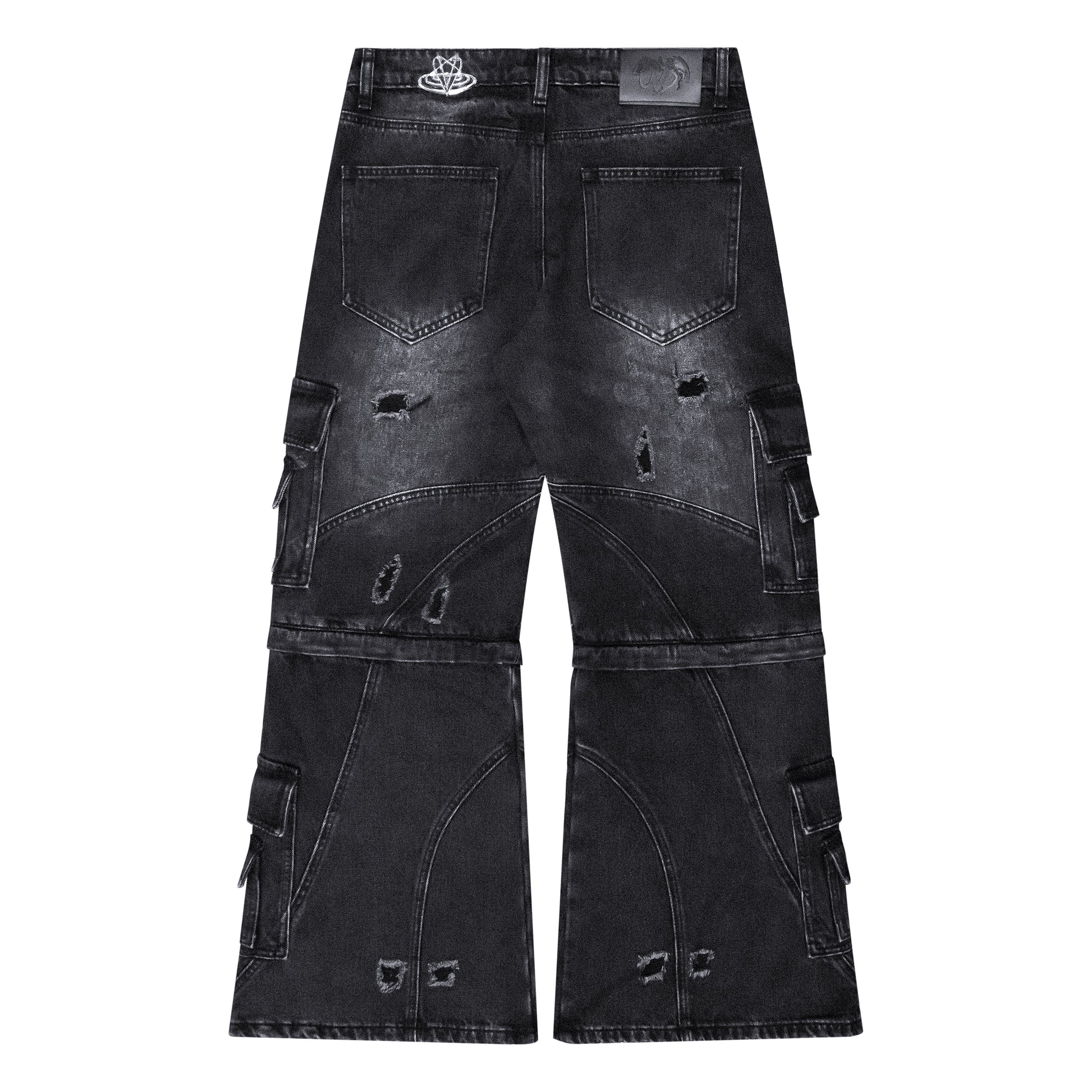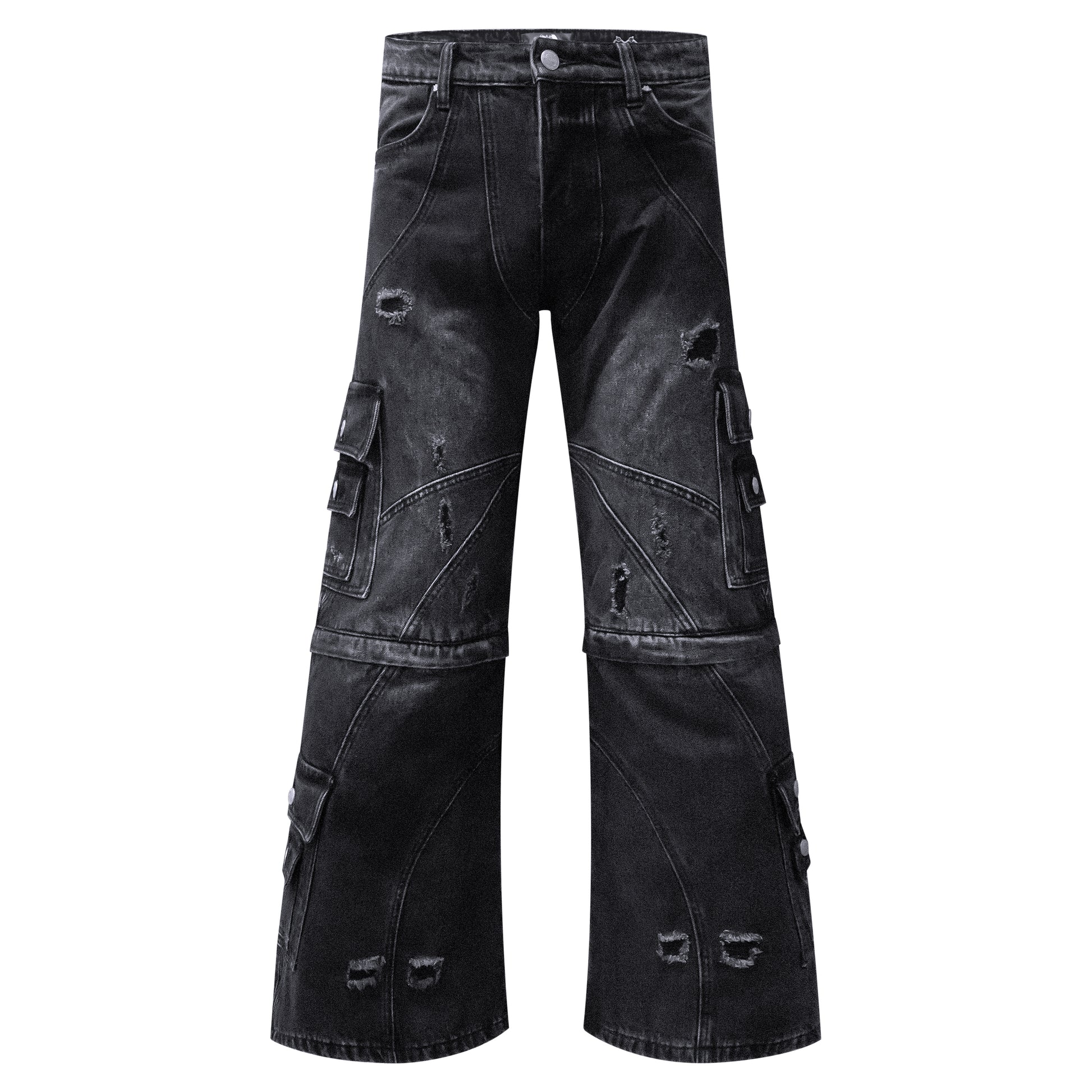 our newest heavyweight denim, DRKANGEL. made with 100% cotton, with all over custom hardware and rivets. leather embossed tag. transforms into jorts, hidden zippers on knees. ultra flared. ready to ship.