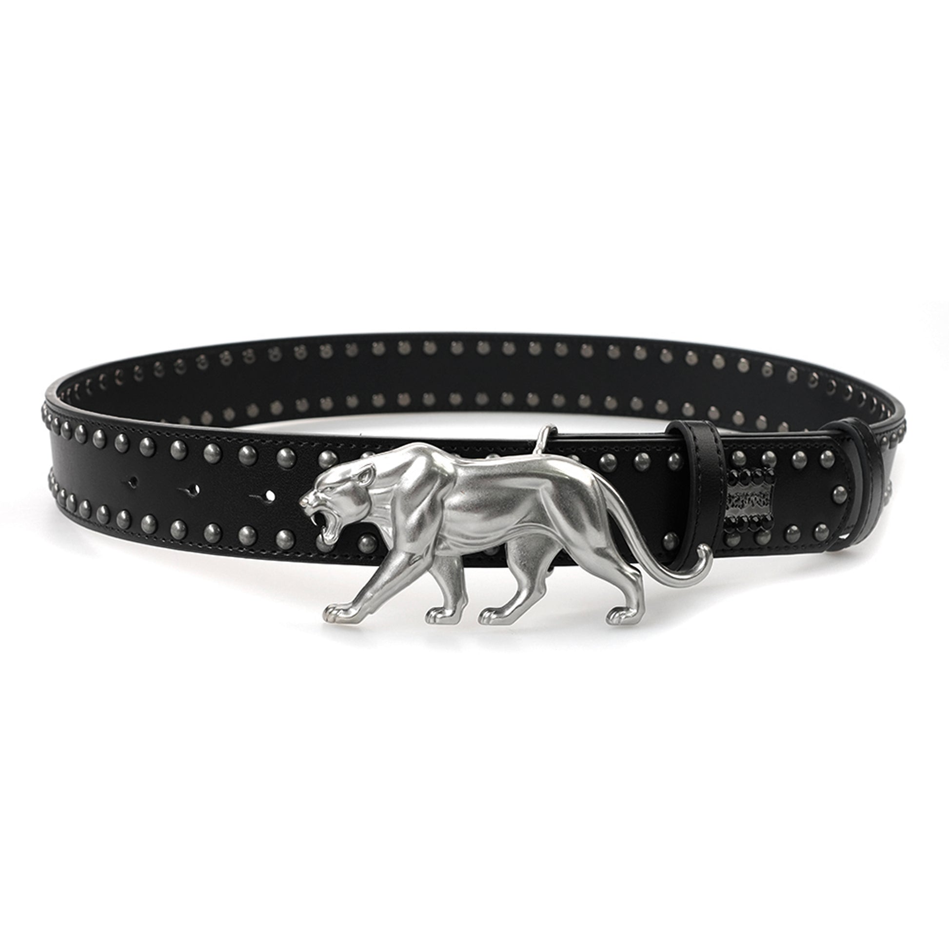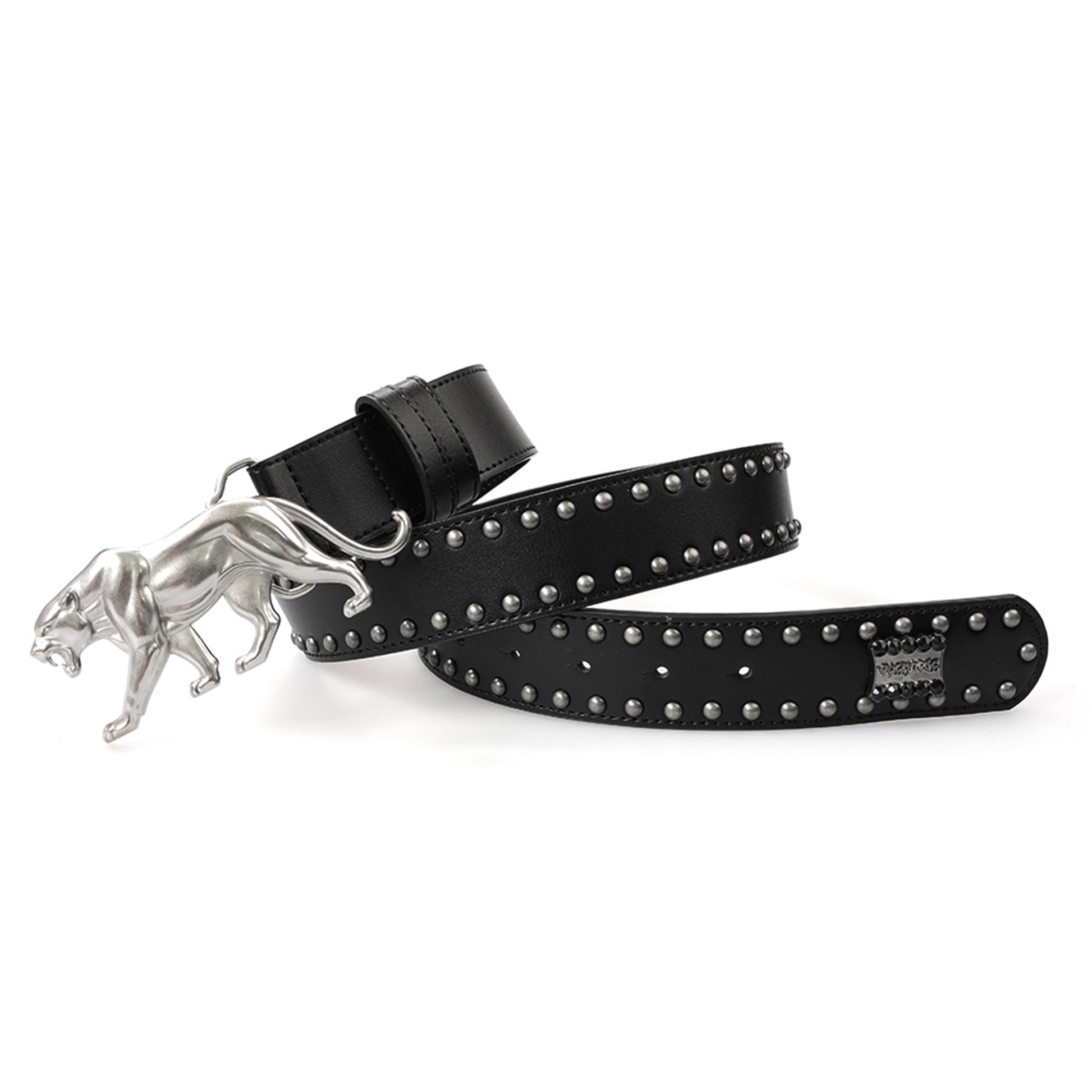 made with vegan leather. heavy metal panther buckle. metal engraved overdose plate. laser engraved ovd tag. studded metal rivets. fits true to size.